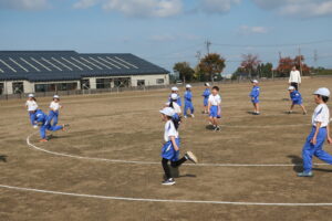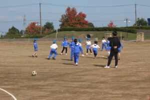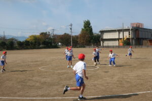 体育科では、今日からドーナツサッカーに取り組みました。真ん中にいるプレーヤーが円の外側にいる味方にしっかりパスできれば2点、味方が止められなかったときは1点、間にいる相手チームのプレイヤーが止めると0点です。初めてのゲームだったので、そんなに作戦を考えることはできなかったのですが、今後、作戦を考えながらプレーできるようにしていきたいと考えています。
