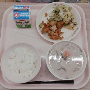 今週は「な~んとおいしい学校給食週間」です。今日の献立は、鶏肉と揚げ里芋の甘辛がらめ、キャベツと柿の昆布あえ、なんとの旬菜豆乳みそ汁、牛乳です。