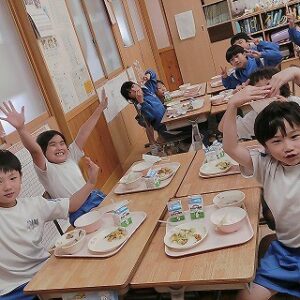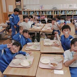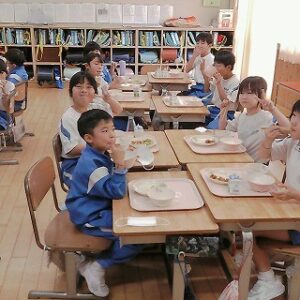 今日の給食には、南砺市産の食材が10種類も使われていました。主菜に入っている里芋は、井波地域の特産です。やわらくて粘り強くおいしい里芋です。子供たちは、給食を味わっていただきました。