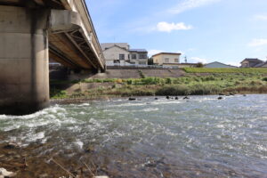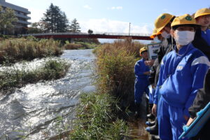 これまで、流れる水のはたらきと、それが地形に与える影響について学習してきたことが、実際の川でも見られるか調べました。