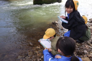 子供たちは、福光大橋周辺と、津沢大橋周辺で、地形や石の様子を比べたり、流れる水の力を実験を通して確かめました。