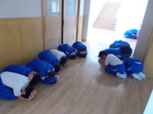 体育館で活動中、突然サイレンが…。真剣な態度で避難訓練を行いました。