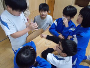理科の学習では、試験管を握ると試験管の先につけたせっけん液が膨らんできたよ~っと驚きの声!!