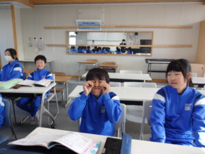 「夢の世界を」では、曲想を生かした歌い方になるよう、ほほえんだ表情の工夫を鏡を見て行いました。