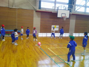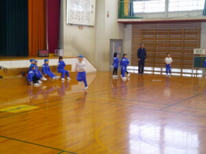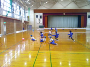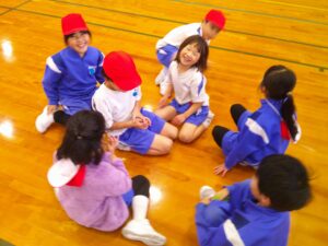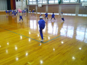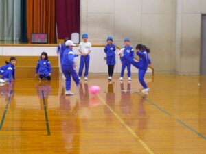 今日は体育科の時間に、体育館でキックベースボールをしました。攻撃側はホームベースに置いたボールを蹴り、直線上に並んだ2つのコーンを目指して走ります。守備側は、蹴られたボールの周りに素早く集まり座ります。守備が座り終わった時点で、蹴った人が1つ目のコーンを通過していれば1点、2つ目のコーンを通過していれば2点が入ります。2回目となる今日は、より多く得点を取るための作戦を考えてからゲームを行いました。今後もっと作戦を考えながらプレーできるようにしていきたいと思っています。