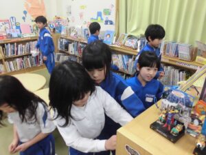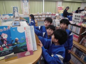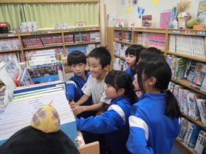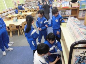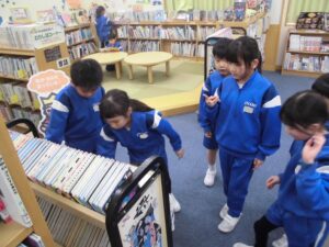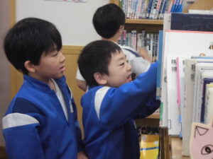 図書委員会の子供たちから出されたヒントを手がかりに、2年生の子供たちは2冊の本を探しました。たくさんの本が並ぶ図書室の中で、友達と相談したり協力したりしながら、楽しそうに本を探していました。