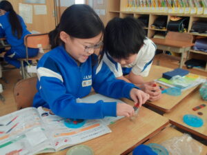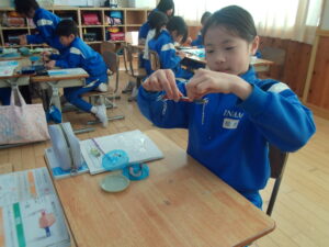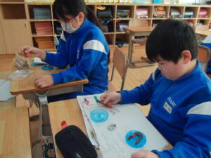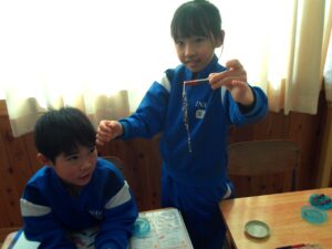 理科の学習で、磁石の極の性質を調べる実験をしました。