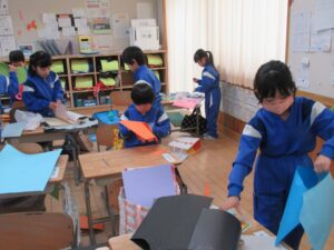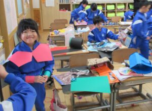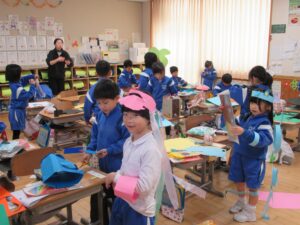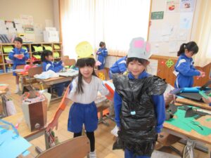 「ここをくっつけたら、腕にはめれたよ。」「帽子とマスクで怪盗になるよ。」「空を飛ぶ羽を作ったよ。」とそれぞれが大変身の準備を楽しんでいます。完成が楽しみです。