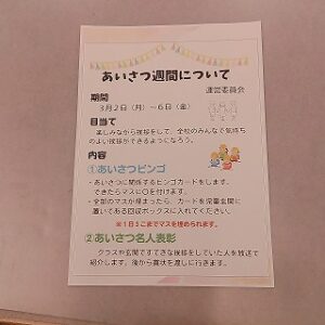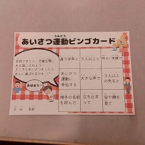運営委員会は、あいさつ週間を実施しています。「楽しみながら挨拶をして、全校のみんなで気持ちのよい挨拶ができるようになろう。」という目当てを持って、「あいさつビンゴ」や「あいさつ名人表彰」を企画し、取り組んでいます。今日はたくさんの子供たちが朝の挨拶運動に参加しました
