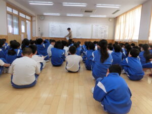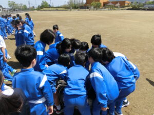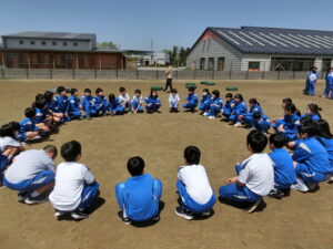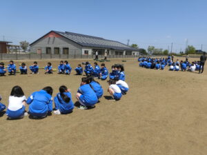運動会の団体競技に向けて、初めて5・6年生が集まり、「タイヤ奪い」のルールや進め方について話を聞きました。また、6年生が中心となり作戦を練り、5年生は6年生を支える立場で団に貢献できるように競技することや、安全に行うこと等を確認しました。その後、グラウンドに出て、子供たちはいろんなサイズのタイヤを持ち、早速、団ごとに作戦を話し合いました。