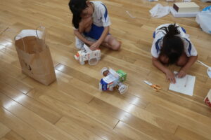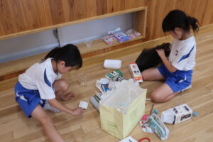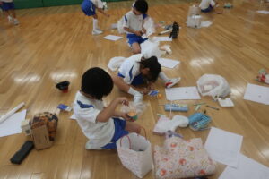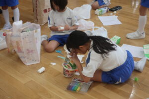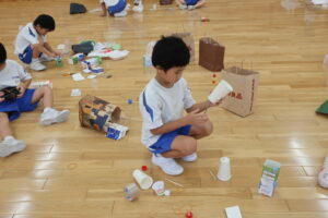 うごくおもちゃづくり(2年生・生活科) 2025年9月19日 2年生 今、生活科では動くおもちゃ作りに取り組んでいます。家から持ってきたいろいろな材料を使って、動くおもちゃをつくっています。最初は何をつくればよいか、なかなか思いつかないようでしたが、子供たちは、少しずついろいろなおもちゃをつくるようになってきました。次はどんなおもちゃができるのかとても楽しみです。