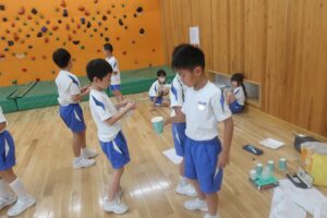 伝言ゲーム(背中に文字)(2年生) 2025年9月11日 2年生 今日の友達づくりゲームは、伝言ゲームをしました。背中に文字を書いて前の人に伝えるゲームです。最初はひらがな1文字、2回目はカタカナ1文字だったのですが、とても難しかったようです。 2回やって、正解したのは1グループだけでした。作戦を立てて、もう一度チャレンジします。