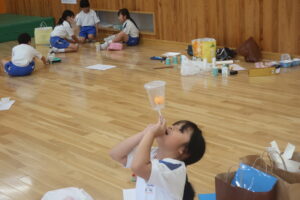 1dLマスを使って(2年生) 2025年7月11日 2年生 今日の算数の時間は、ペットボトルに入っている水の量を1dLマスを使って量りました。グループで協力しながら量りました。暑い日でしたが、水を扱うことは楽しかったようです。