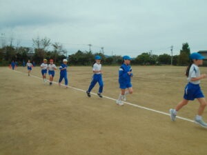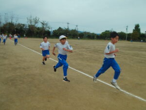 持久走練習(3年生) 2025年10月9日 3年生 3年生は、持久走に向けてダッシュと5分間走に取り組みました。 5分間走では、持久走での目標や頑張りたいことを意識しながら走りました。男女に分かれて走るとき、走っている友達に向かって「頑張れ!」「すごい!」と大きな声で応援していました。