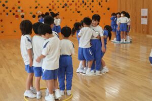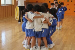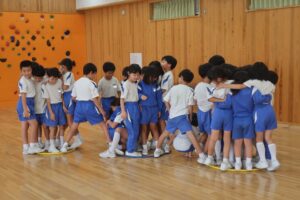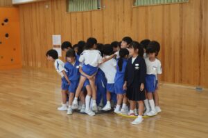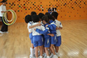 ブラックホール2(友達づくりゲーム:2年生) 2025年10月2日 2年生 昨日に引き続き、ブラックホールを行いました。最初は楽々だったのですが、安全地帯のフラフープが減ってくると子供たちは何とかみんな助かろうといろいろ工夫していました。大盛り上がりの時間でした。