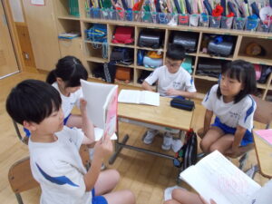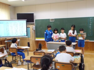 4年生は、国語科で「ごんぎつね」を読んで学習しています。まず、登場人物の気持ちを考え、それに対する自分の感想をもちました。今日は、物語の結末はどうなるのかというテーマで、自分が考えたことをグループ内で話し合い、それをみんなに発表し、シェアしました。「やっぱり兵十は後悔の気持ちが強いと思う」「ごんは、やっとわかってもらったという安心感で天国で見守っていると思う」「兵十は、罪悪感いっぱいで、ごんの毛皮を作ってずっと一緒に暮らしたのではないか。これで、ひとりぼっちじゃないね」など、いろいろな感想を伝え合いました。