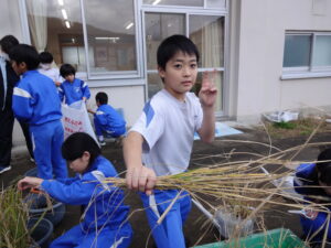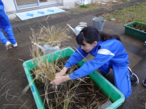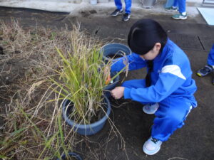 5年生の総合的な学習では、これまでバケツ稲に挑戦していましたが、長かった夏を終え、枯れてしまったものも少なくありません。