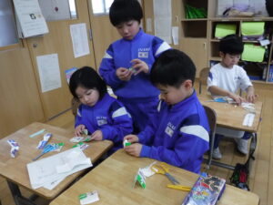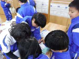 「なかよし しゅうかい」の準備 1年生 生活科 2026年1月28日 1年生 2月3日に半日入学があります。 1年生は、学校のすてきを年長さんに伝え、年長さんと自分たちが笑顔になることを目当てに「なかよし しゅうかい」を企画しています。 学校の紹介、ゲーム、工作など、年長さんを楽しませることを考えてプログラムを相談しました。 「その言い方は、年長さんに意味が分かるかな」「もっと大きな声で話そう」など、1年前を思い出しながら、準備を進めている様子に成長が感じられます。