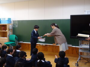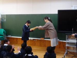 その後の朝の会では、三連休にがんばってきた子供たちの授賞を学年で行いました。