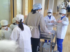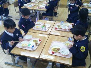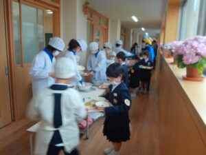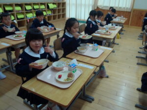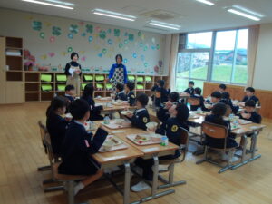 初めての給食(1年生・6年生) 2026年4月10日 1年生, 6年生, 給食 初めての給食にわくわくした様子の1年生に、6年生が配膳のお手伝いをしてくれました。 手際よく料理を盛り付けたり、お盆にのせたりと、さすが最上級生。優しく声をかけながらサポートする姿がとても頼もしく感じられました。 1年生は、「おいしい!」と笑顔で話しながら、楽しそうに給食を味わっていました。