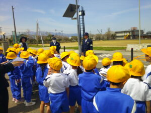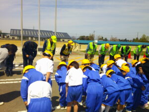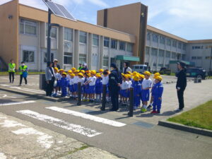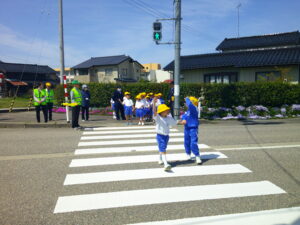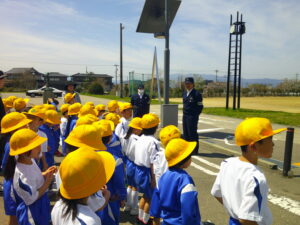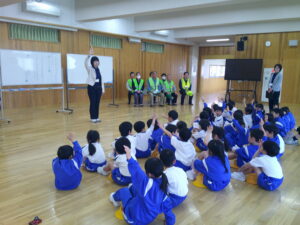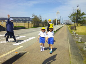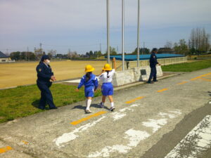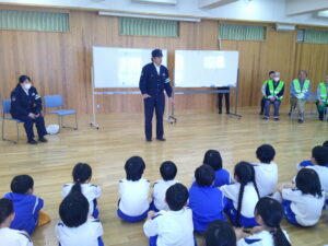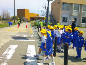 交通安全教室(1年生) 2026年4月14日 1年生 1年生は交通安全教室をしました。警察署の方から横断歩道の渡り方等についてお話を聴きました。道路では①とび出さない、②遊ばない、③自分の目で確かめるの3つのことを守ることを約束しました。「横断歩道前で止まる」「右、左、右と確認する」「(車から見えるように)手を上げる」等、教えていただいたことを確かめながら実際に歩道や横断歩道を歩きました。教えていただいたことを忘れないように、お家の方と一緒に練習するといいですね。